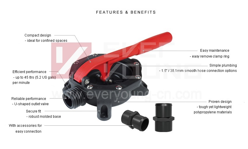 - 参数: • DIAPHRAGM HAND PUM P • Polypropylene body • Stainless steel fastenings • Flow Rate: 45L/min • Hose Connections: 34.5mm • Product Weight: 0.45kg